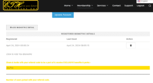 3. After enrolling the biometric, the registered biometric details table get updated with new biometric data on the personal account page.